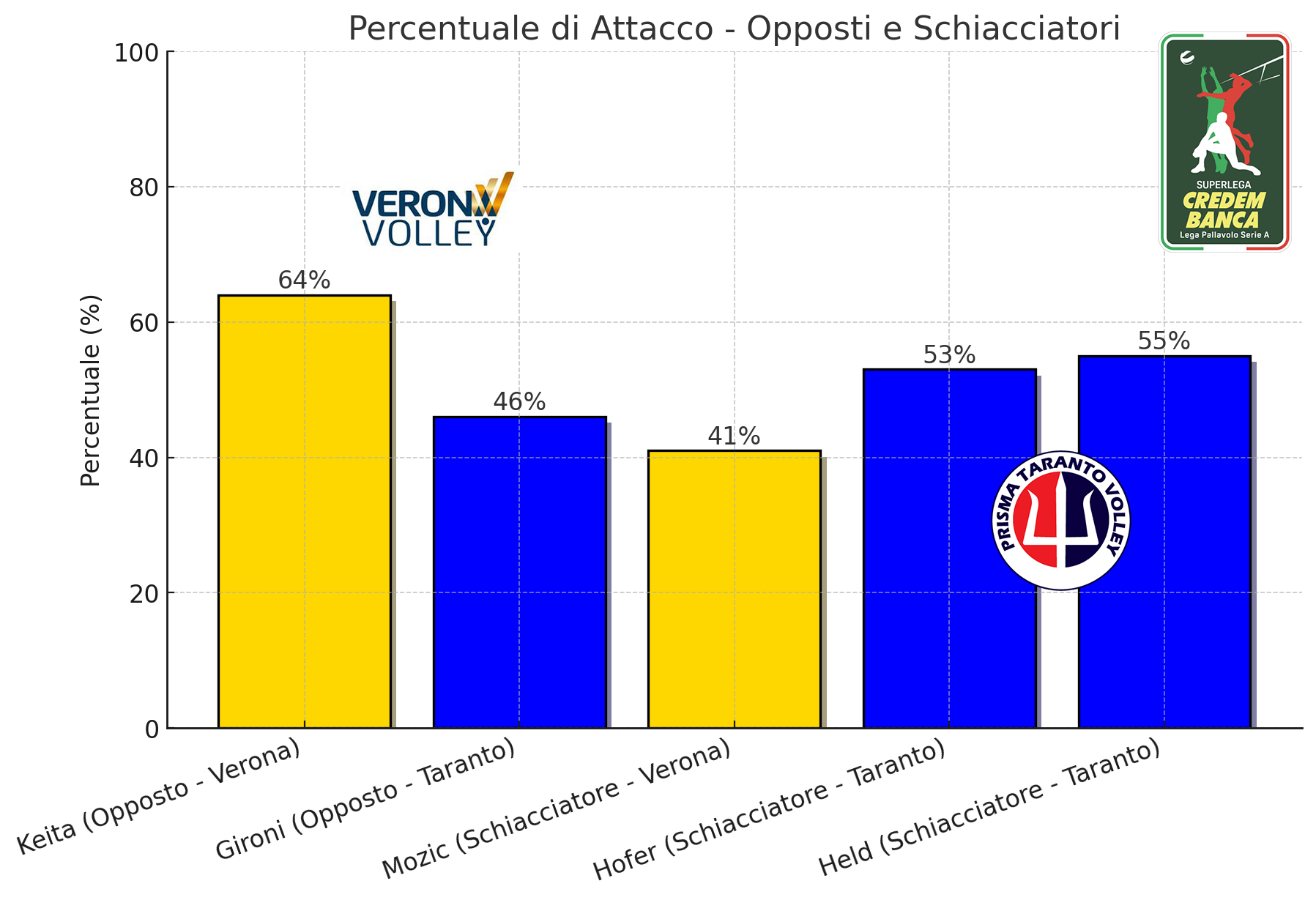 Nonostante una non eccelsa percentuale di efficacia in attacco del 41%, il posto quattro Mozic ha offerto un contributo significativo in ricezione, con un 69% di ricezioni positive. Questo equilibrio tra attacco e ricezione lo rende un giocatore fondamentale per il sistema di gioco di Verona. In casa tarantina, con un'efficacia del 46% in attacco, l’opposto Gironi ha fornito un contributo discreto, ma non eccezionale, rispetto al suo omologo Keita.