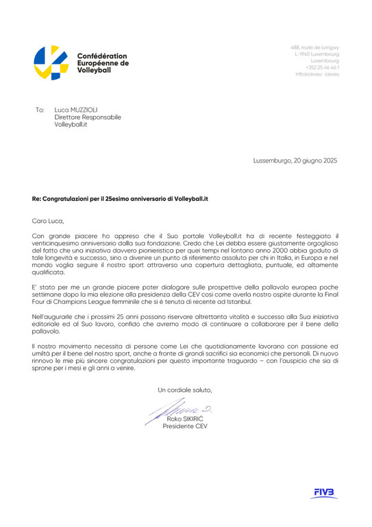 Con grande piacere ho appreso che il Suo portale Volleyball.it ha di recente festeggiato il venticinquesimo anniversario dalla sua fondazione. Credo che Lei debba essere giustamente orgoglioso del fatto che una iniziativa davvero pionieristica per quei tempi nel lontano anno 2000 abbia goduto di tale longevità e successo, sino a divenire un punto di riferimento assoluto per chi in Italia, in Europa e nel mondo voglia seguire il nostro sport attraverso una copertura dettagliata, puntuale, ed altamente qualificata.