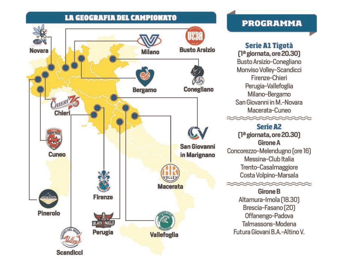 La mappa della Serie A1 Tigotà 2025/26 racconta più di mille parole: la pallavolo femminile italiana, almeno nella sua massima espressione, si ferma tra Umbria e Marche e non scende più a sud. La distribuzione delle squadre è eloquente: quattro piemontesi, tre lombarde, due toscane, due marchigiane, una emiliana, una veneta e una umbra. Nessuna presenza da Perugia in giù...