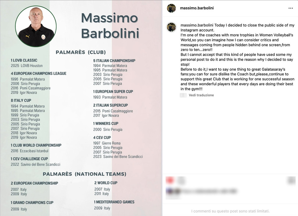 "Oggi ho deciso di chiudere il mio Instagram. Sono uno degli allenatori con più trofei al mondo nel volley femminile, quindi potete immaginare come reagisco alle critiche e ai messaggi di persone nascoste dietro a uno schermo: da zero a dieci… zero! Ma non posso accettare che alcune persone utilizzino i miei post personali in questo modo. Perciò ho deciso di dire basta. Prima di farlo, voglio dire qualcosa ai grandi tifosi del Galatasaray: potete anche non apprezzare l’allenatore, ma per favore continuate a sostenere questo grande club, che sta lavorando per una stagione di successo, e queste meravigliose giocatrici, che ogni giorno danno il massimo in palestra" – ha scritto Barbolini.