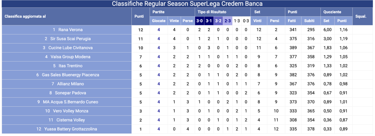 “Era già tutto previsto”, verrebbe da dire guardando la classifica di Superlega dopo appena quattro giornate. Le squadre si sono già distribuite quasi esattamente dove ce le aspettavamo: in alto le favorite, mentre Padova, Cuneo, Monza, Cisterna e Grottazzolina si trovano già a combattere nella parte bassa. Eppure, qualche nota fuori spartito c’è: Modena è un po’ più in alto del previsto, Milano un po’ più in basso, e entrambe dovranno trovare i loro equilibri. Insomma, la musica è partita, ma non tutto è scritto fino in fondo.
