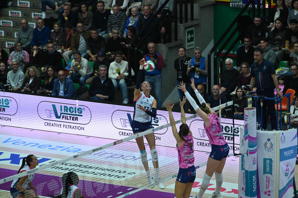 Nel primo parziale le venete trovano lo strappo nel finale e chiudono 25-22 con le accelerazioni di Gabi. Le toscane reagiscono nel secondo, rientrano dal 20-17 e completano la rimonta con il muro del 23-25 firmato Antropova. La terza frazione resta in equilibrio fino al 17-17, poi Haak e Sillah firmano l’allungo decisivo e Gabi chiude 25-22, mentre nel quarto set le Pantere prendono presto il controllo fino al 25-16 finale.