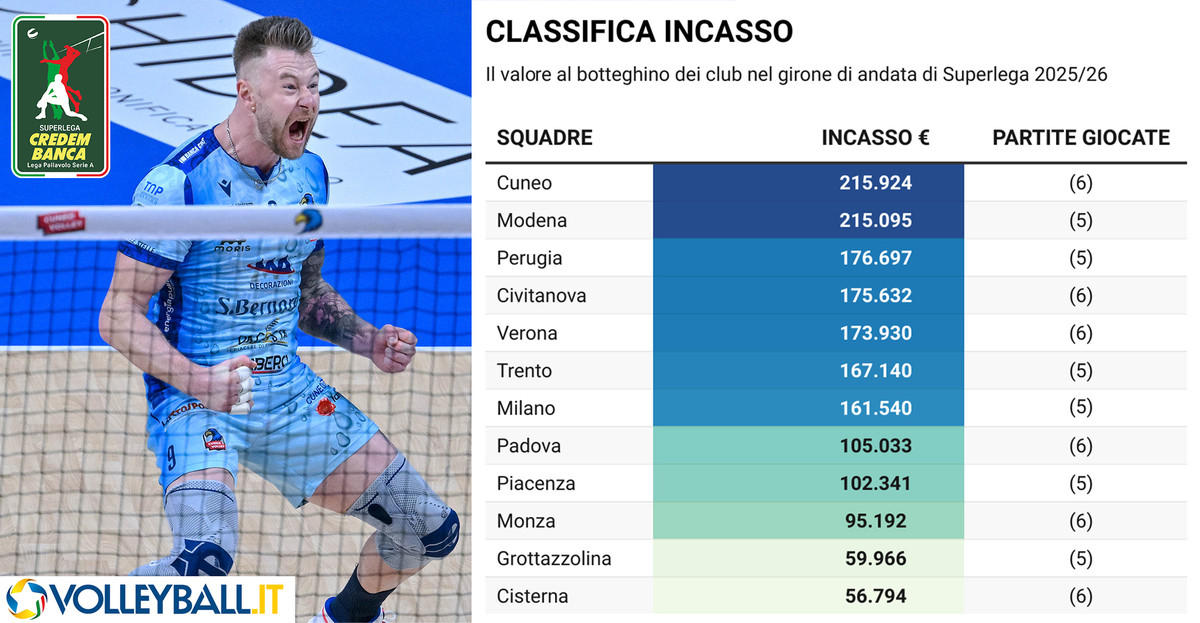 La classifica degli incassi totali vede Cuneo al primo posto con 215.924 euro raccolti in sei partite casalinghe. Valore praticamente identico per Modena, seconda con 215.095 euro, ma ottenuti in cinque gare. Sono le uniche due società ad aver superato il muro dei 200.000 euro nel girone di andata. Seguono Perugia, Civitanova e Verona, tutte concentrate in un margine ristretto.