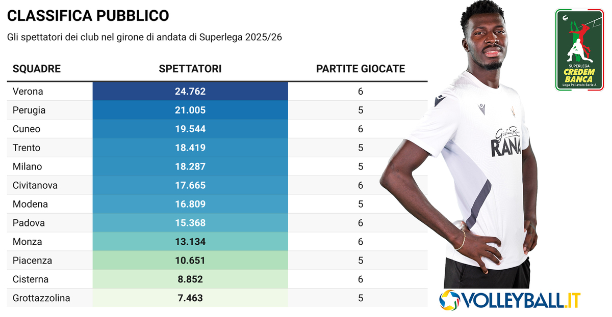 MODENA – I dati di pubblico del girone di andata della Superlega offrono una fotografia chiara dell’andamento degli impianti delle dodici squadre del massimo campionato maschile, tra valori assoluti e medie che aiutano a leggere meglio il quadro complessivo.