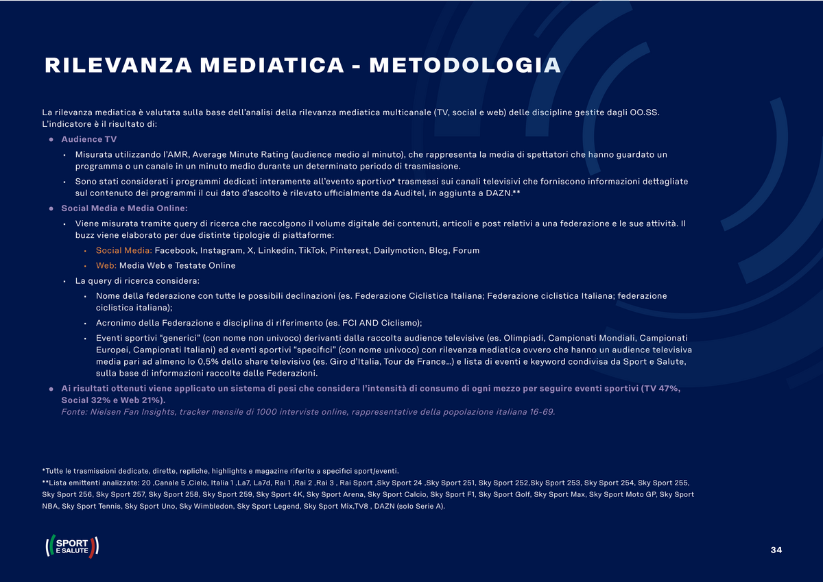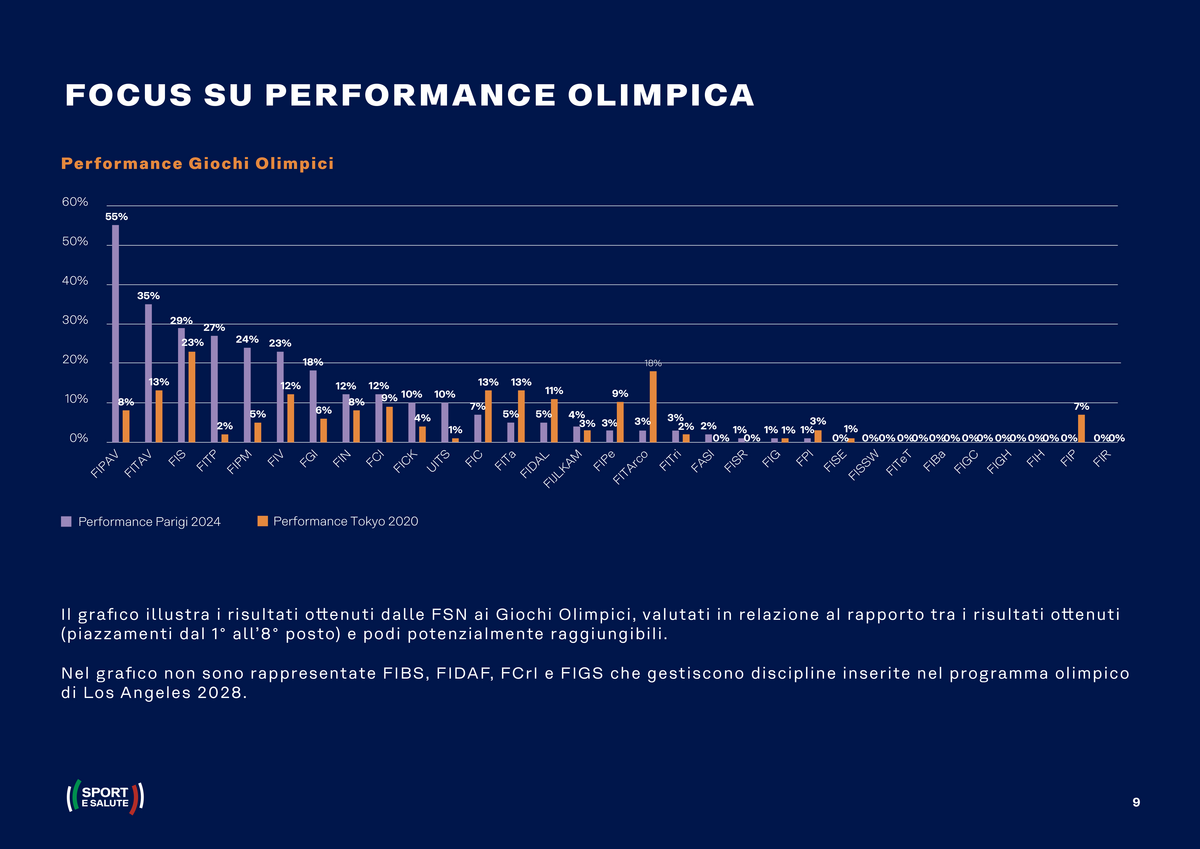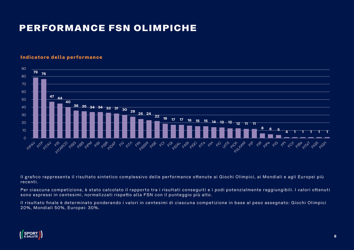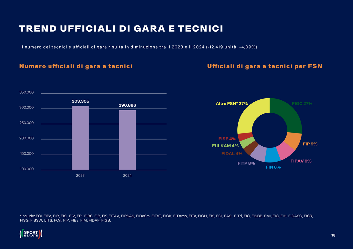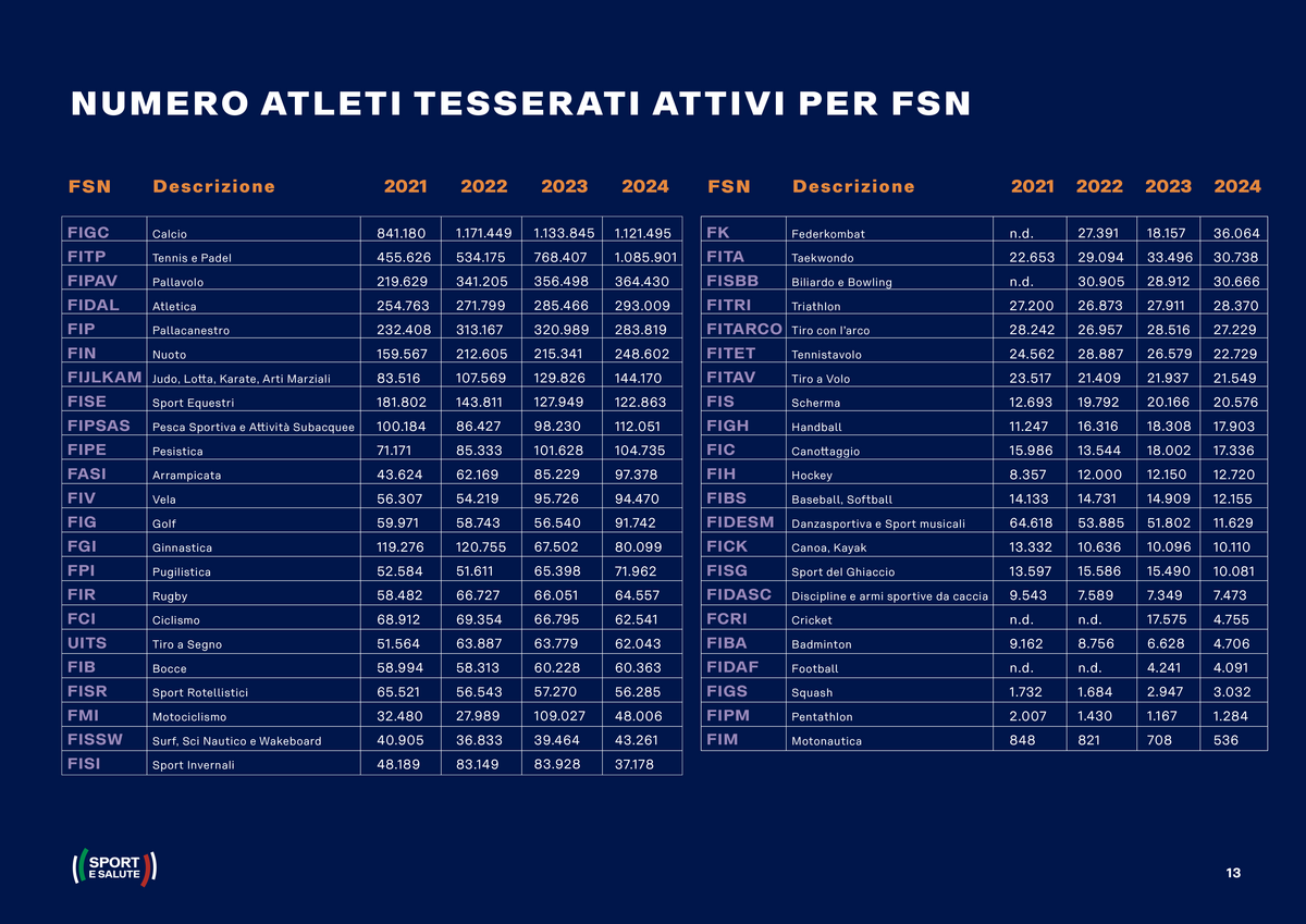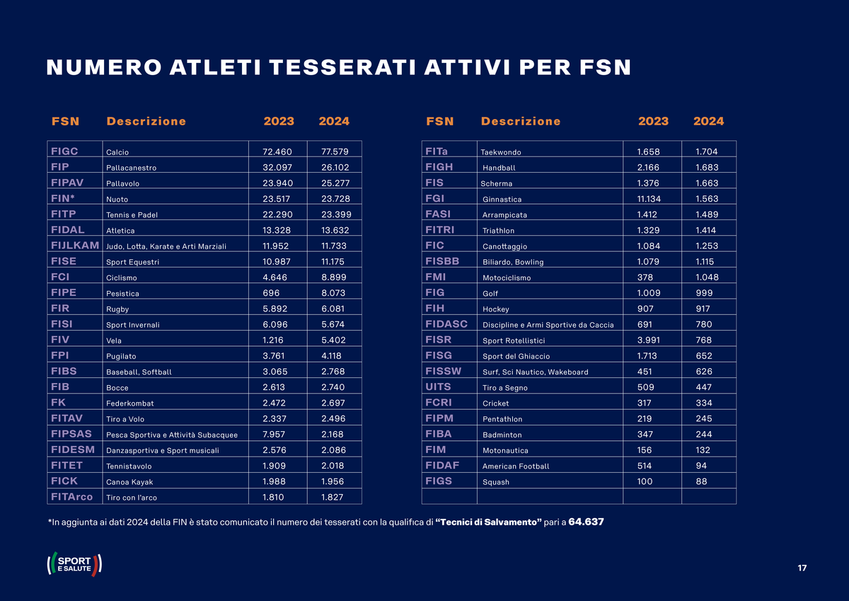 Il report segnala: oltre 640 mila nuovi praticanti nello sport organizzato negli ultimi anni; un sistema sempre più orientato ai pilastri ESG (sostenibilità, governance, impatto sociale); investimenti infrastrutturali che raggiungeranno 1,25 miliardi di euro entro il 2027, con priorità alle periferie e agli impianti di base.
