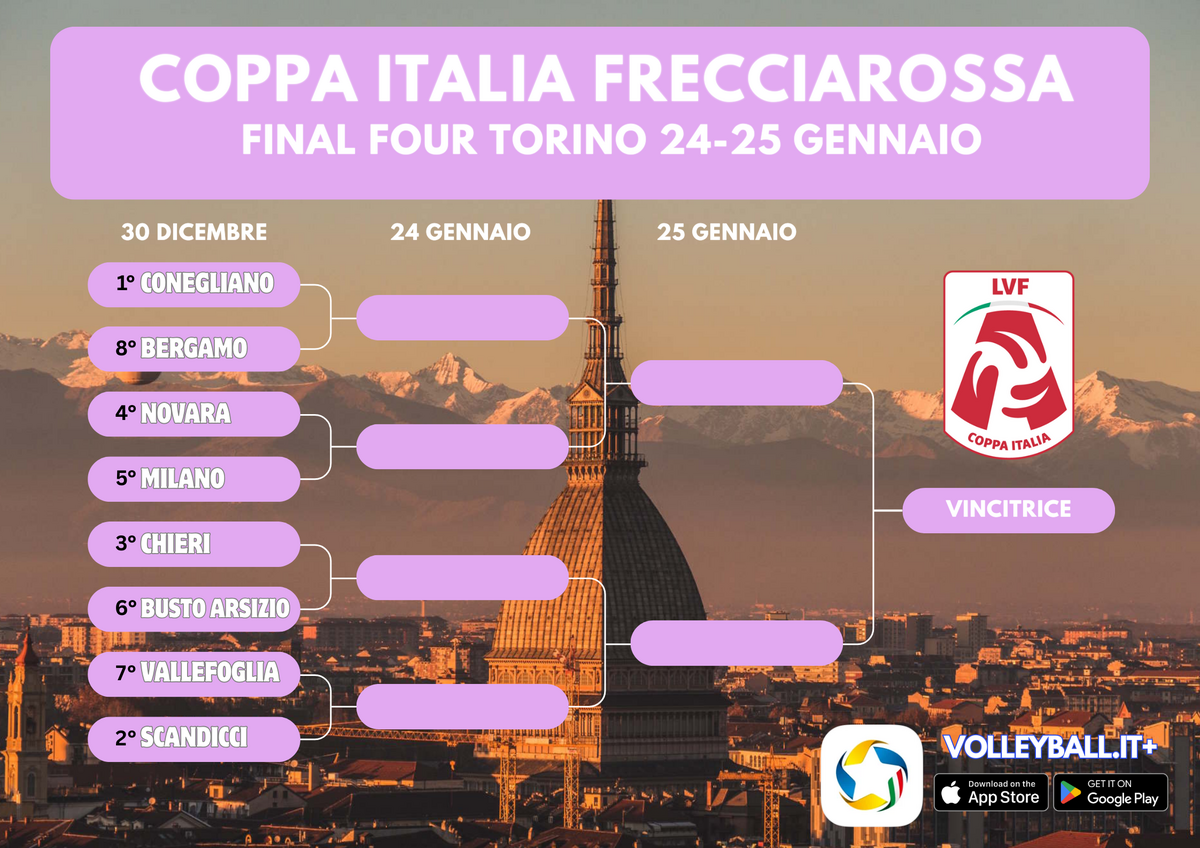 MODENA - Otto squadre, quattro posti e una sola partita per continuare il cammino. Domani, Martedì 30 dicembre, la Coppa Italia Frecciarossa entra nella sua fase decisiva con i Quarti di Finale, gara secca che assegnerà i pass per le Final Four in programma il 24 e 25 gennaio all’Inalpi Arena di Torino. Le migliori otto della Serie A1 Tigotà al termine del girone d’andata si giocano tutto in una notte che può indirizzare la stagione.