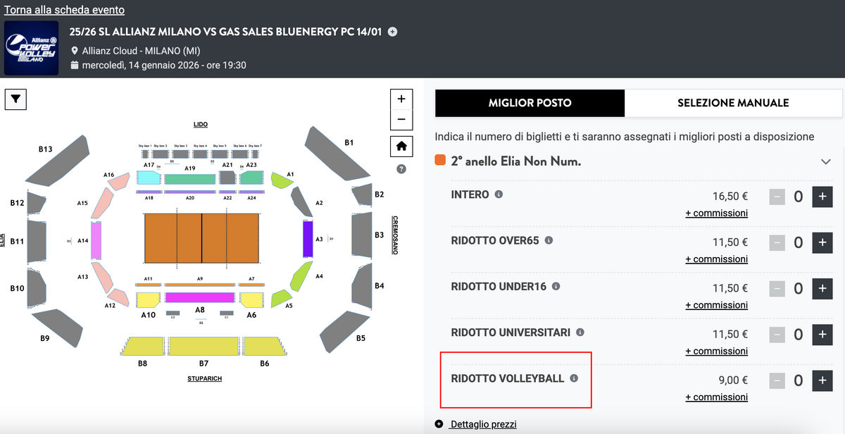 MILANO – L'app Volleyball.it+ ti porta all'Allianz Cloud con uno sconto del 50% sui biglietti del 2° anello Curva Biancorossa Non Numerata e 2° anello Elia Non Numerata per la sfida di mercoledì 14 Gennaio 2026 alle ore 19.30 tra Allianz Milano e Gas Sales Bluenergy Piacenza