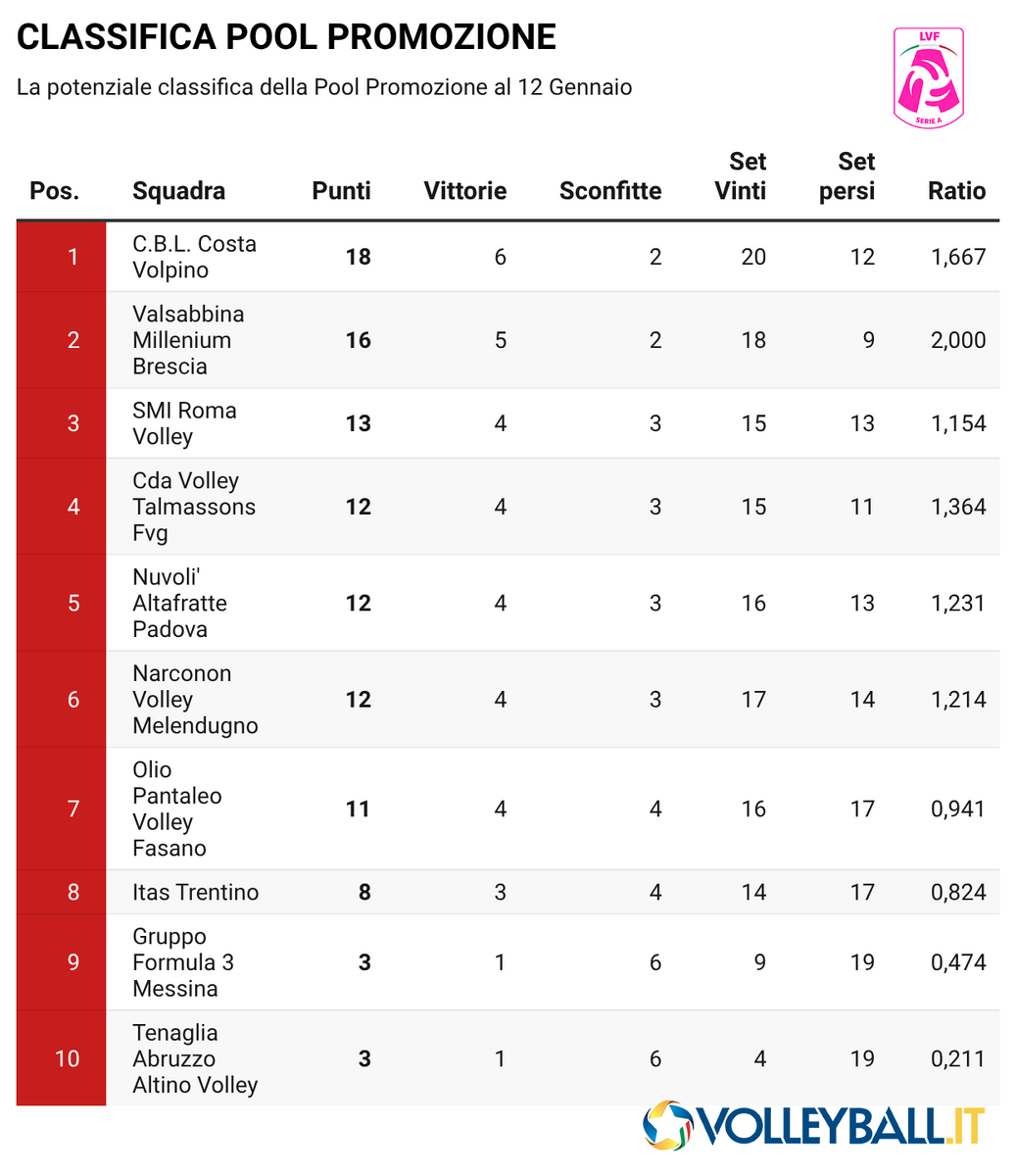 Restano quindi due posti da assegnare (uno per girone) e sono sei le squadre ancora “in bilico”. Nel Girone A la corsa al quinto posto coinvolge Gruppo Formula 3 Messina e Clerici Auto Concorezzo (entrambe a 16 punti) e Marsala Volley (15). Nel Girone B, invece, la lotta riguarda Tenaglia Abruzzo Altino Volley (24), Futura Giovani Busto Arsizio (23) e Panbiscò Leonessa Altamura (23).