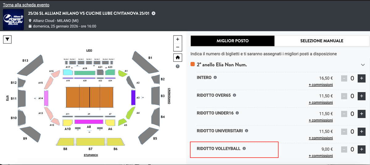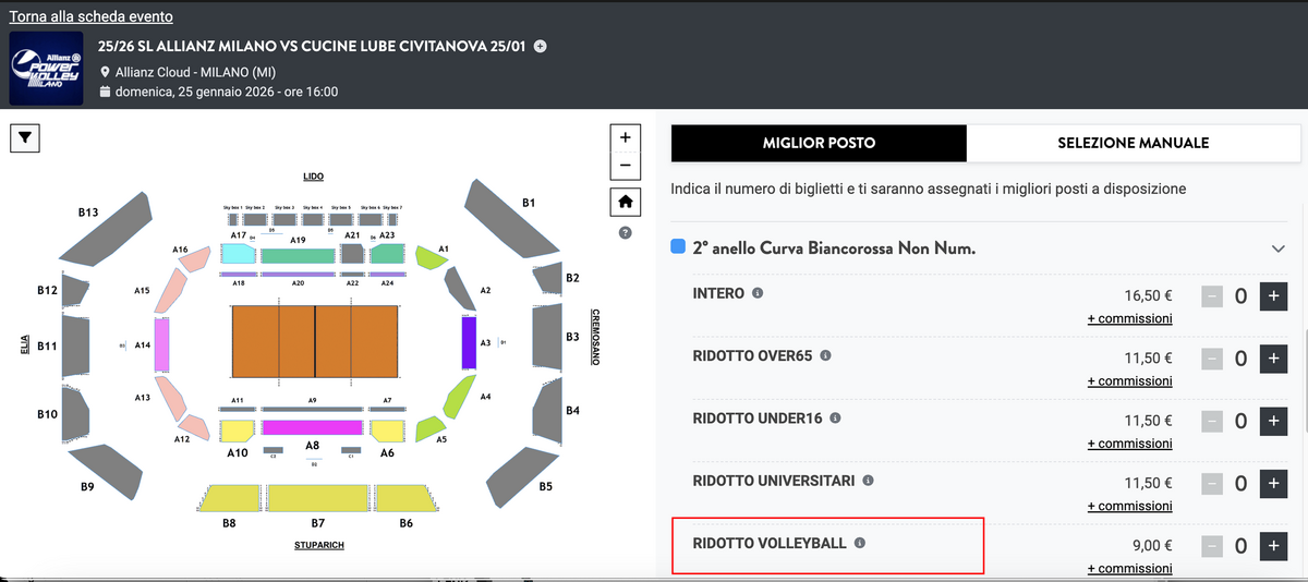 MILANO – L'app Volleyball.it+ ti porta all'Allianz Cloud con uno sconto del 50%* sui biglietti del 2° anello Curva Biancorossa Non Numerata e 2° anello Elia Non Numerata per la sfida di domenica 25 Gennaio 2026 alle ore 16.00 tra Allianz Milano e Cucine Lube Civitanova.