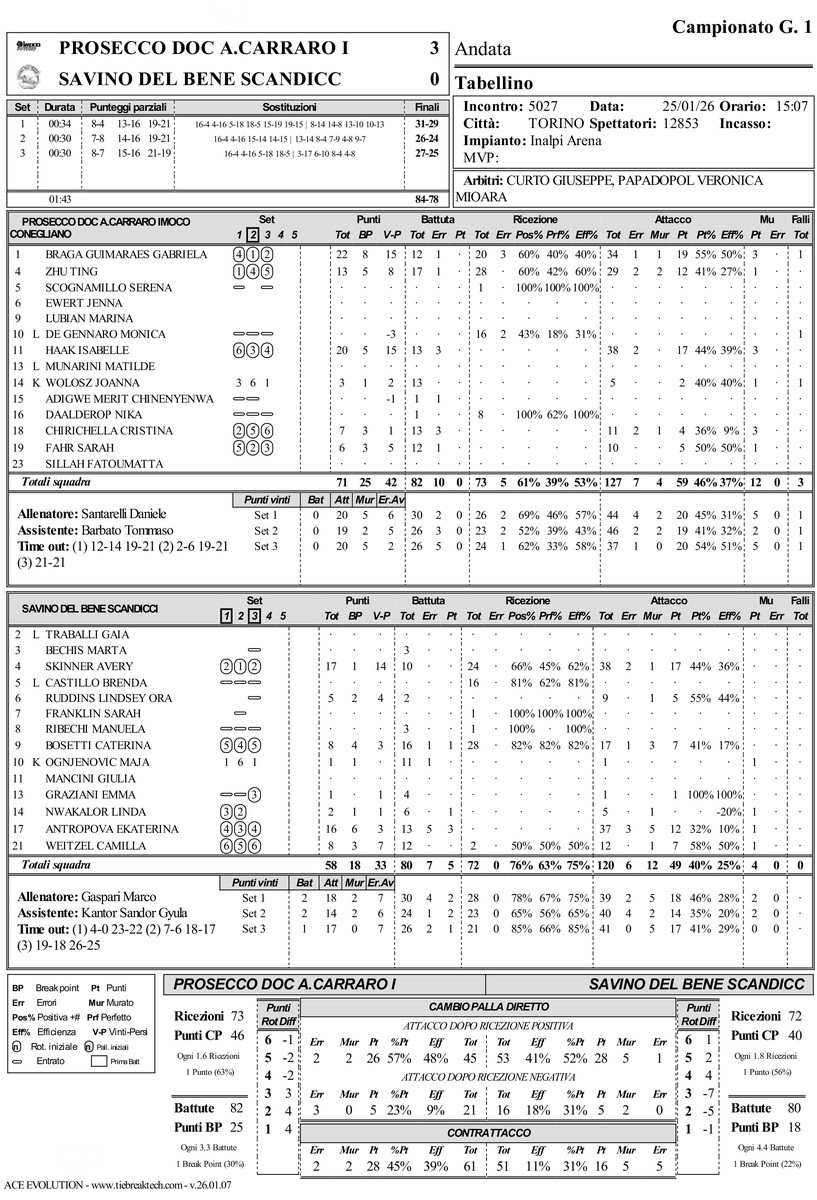 PROSECCO DOC A.CARRARO IMOCO CONEGLIANO: Zhu 13, Chirichella 7, Wolosz 3, Braga Guimaraes 22, Fahr 6, Haak 20, De Gennaro (L), Sillah, Lubian, Daalderop, Ewert, Adigwe, Scognamillo, Munarini (L). All. Santarelli. SAVINO DEL BENE SCANDICCI: Ognjenovic 1, Skinner 17, Nwakalor 2, Antropova 16, Bosetti 8, Weitzel 8, Castillo (L), Ruddins 5, Graziani 1, Mancini, Bechis, Ribechi, Traballi (L), Franklin. All. Gaspari.