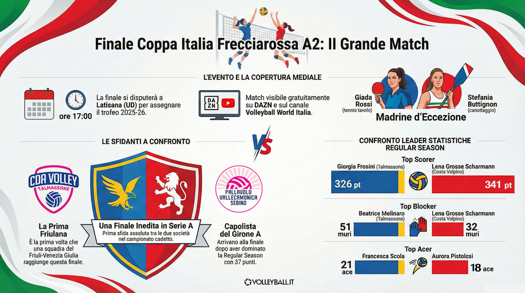 La Coppa Italia Frecciarossa A2 assegnerà così un nuovo nome all’albo d’oro, che nell’ultima edizione ha visto il successo di Omag-MT San Giovanni in Marignano su Itas Trentino. Per Talmassons e Costa Volpino sarà l’occasione di scrivere una pagina nuova della propria storia, in una finale che unisce novità, equilibrio e un forte significato sportivo.