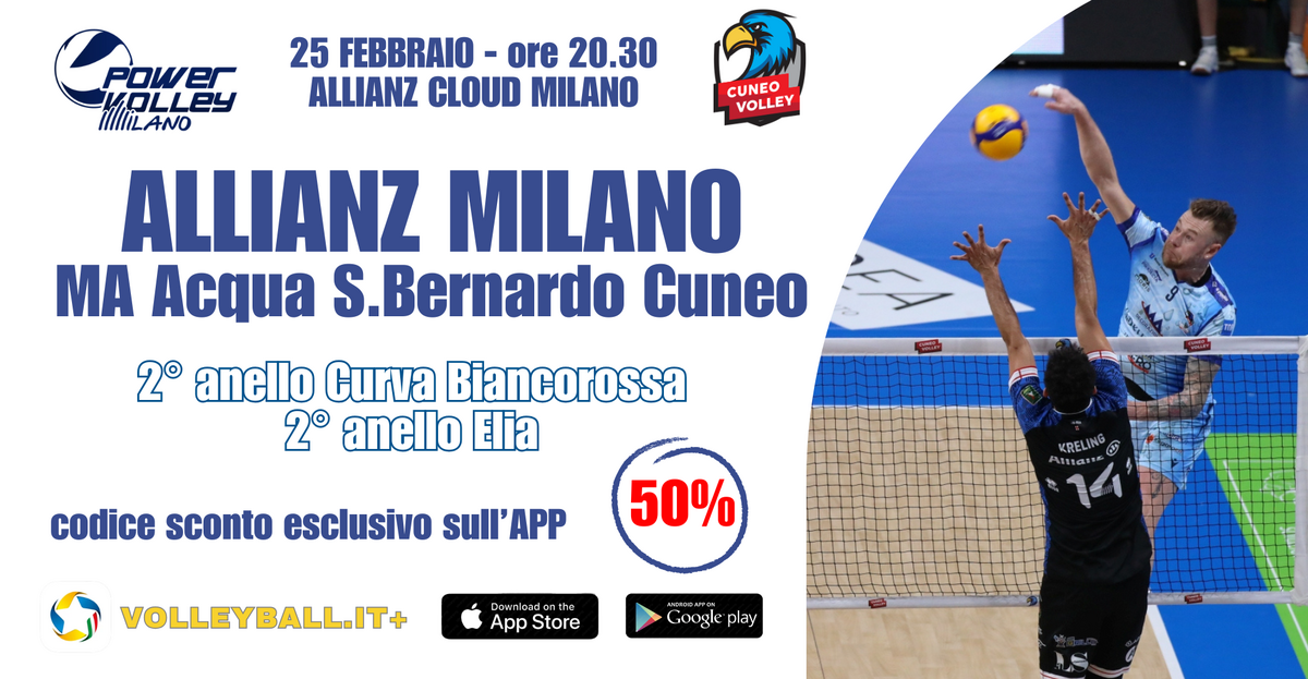 MILANO - Ultimo appuntamento della regular season di SuperLega Credem Banca con turno infrasettimanale: mercoledì alle 20.30 l’Allianz Cloud ospita la sfida tra Allianz Milano e MA Acqua S.Bernardo Cuneo. Un confronto che, pur non incidendo sull’accesso ai play off scudetto per alcune formazioni, può ancora definire gli equilibri in classifica dalla terza alla quinta posizione – con Trento, Modena e Piacenza racchiuse in un punto – e dalla nona all’undicesima, dove sono coinvolte Padova, Cisterna e Cuneo. Per queste ultime non c’è più la possibilità di entrare nei play off per il tricolore, ma resta l’accesso ai play off per il 5° posto, insieme alle quattro eliminate dei quarti, con in palio la qualificazione alla Challenge Cup.