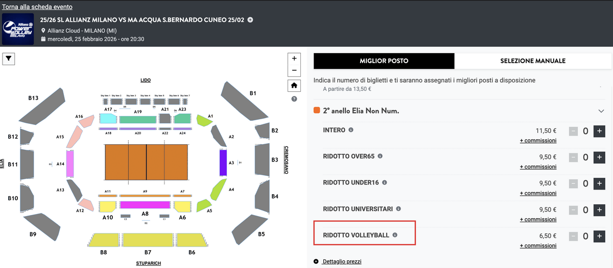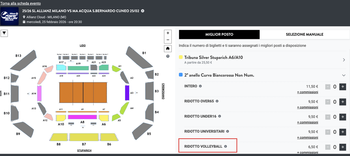 MILANO – L'app Volleyball.it+ ti porta all'Allianz Cloud con uno sconto del 50%* sui biglietti del 2° anello Curva Biancorossa Non Numerata e 2° anello Elia Non Numerata per la sfida di mercoledì 25 febbraio 2026 alle ore 20.30 tra Allianz Milano e MA Acqua S.Bernardo Cuneo.