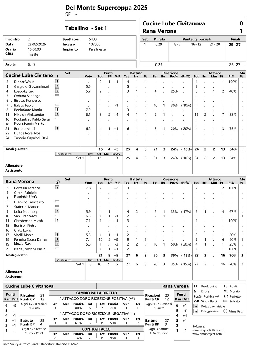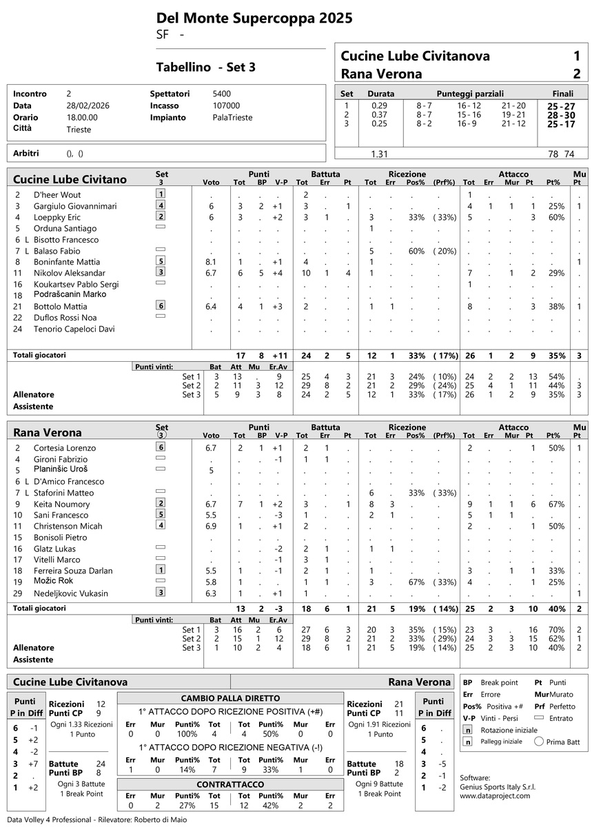 TRIESTE - I tabellini set per set della seconda semifinale tra Civitanova e Verona.