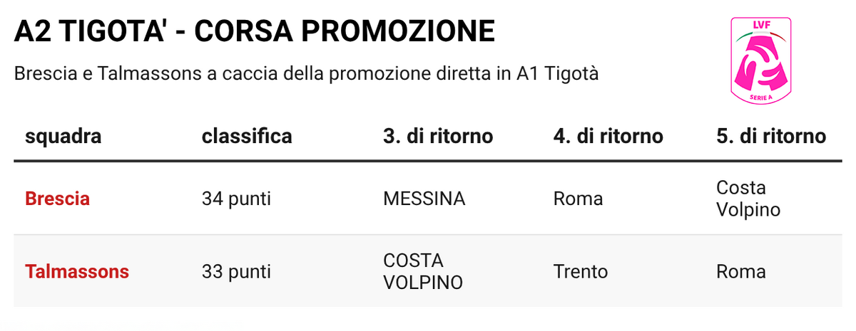 A Latisana (domenica alle 17) Talmassons ritrova invece Costa Volpino con un carico doppio: classifica e rivalsa sportiva. Le orobiche sanno che la pressione è tutta dalla parte friulana, ma chiedono pazienza e lucidità: Gaia Dell’Amico avverte che "Talmassons gioca in casa e sicuramente cercherà di riscattare le due sconfitte precedenti, per loro questi punti sono fondamentali. Noi dovremo avere pazienza e rimanere concentrate per imporre il nostro ritmo". Un incrocio che interessa anche a Brescia, spettatrice più che interessata: un risultato “sporco” o un colpo esterno può ridisegnare la vetta proprio quando mancano tre giornate alla fine.