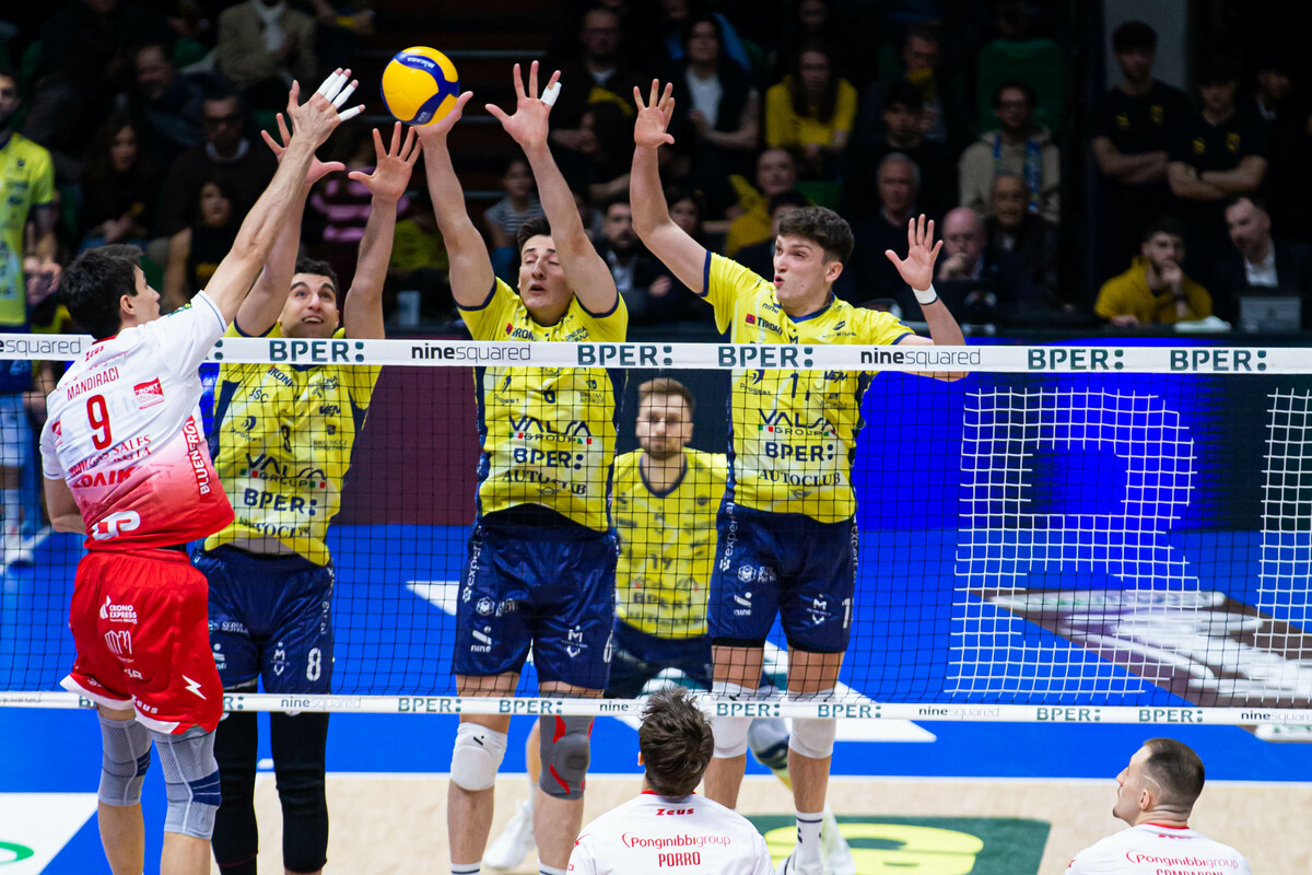 La formazione biancorossa si porta rapidamente sul 2-0, imponendosi 25-23 e 25-22 nei primi due set. Con il passare della partita, però, cresce la squadra gialloblù che riesce a ribaltare l’inerzia del match. Decisiva soprattutto la pressione al servizio, con Paul Buchegger autore di otto ace, e la prova offensiva di Luca Porro, premiato MVP grazie a 20 punti e al 53% in attacco.