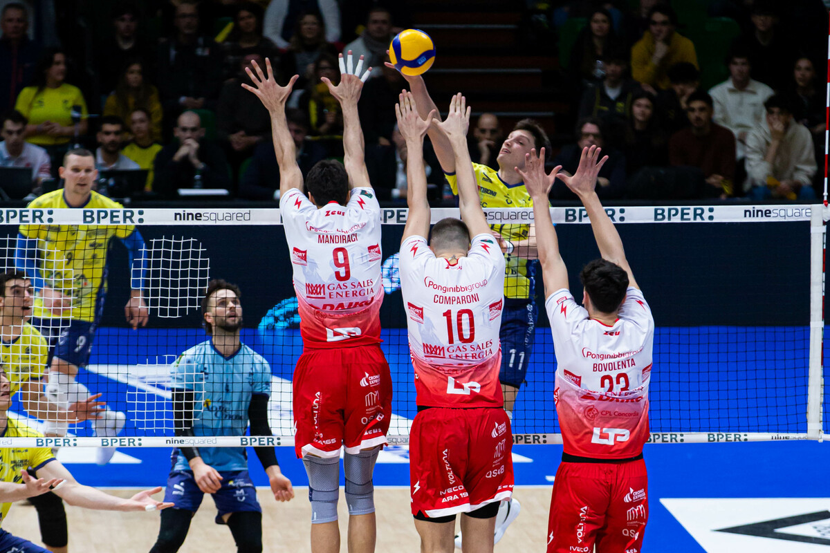 LA PARTITA - Il parziale si apre con equilibrio, ma il primo break è di Piacenza grazie al servizio di Bovolenta. Modena ricuce fino all’8-8, poi gli attacchi di Mandiracı e un errore di Buchegger portano gli ospiti avanti 9-12. La battuta dei gialloblù cambia l’inerzia: prima Mati, poi due turni efficaci di Buchegger mettono in difficoltà Pace e Modena passa 14-13. Piacenza replica con il muro di Paolo Porro su Davyskiba per il nuovo sorpasso (17-18). Nel finale il servizio di Paolo Porro crea problemi alla ricezione modenese e il muro di Comparoni su Luca Porro vale il 20-22. Sanguinetti accorcia a muro su Gutierrez, poi ancora Buchegger al servizio firma l’ace del 22-22. Modena passa 23-22, ma Mandiracı risponde immediatamente, trova anche l’ace del 23-24 e, sull’azione successiva, Gutierrez mura Buchegger per il 23-25. Modena riceve meglio e trova cinque ace, ma paga la scarsa efficacia offensiva e i cinque muri subiti; Piacenza invece sfrutta il 50% in attacco per indirizzare il set.