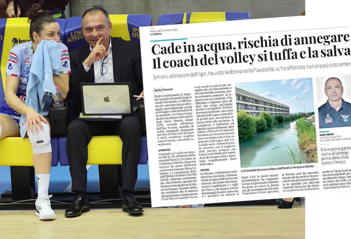 TREVISO – Dario Simoni protagonista di un salvataggio lungo il Piavesella: il vice allenatore dell’Igor Gorgonzola Novara si è tuffato in acqua per soccorrere una donna di 65 anni, evitando conseguenze più gravi.
