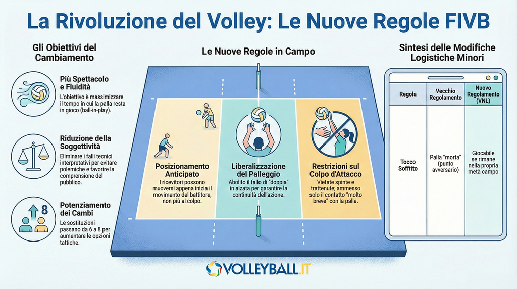 Confermati quasi tutti i rumors (per i quali un componente della commissione è stato sanzionato), ad eccezione di quello che si vociferava sul ruolo del Libero, che avrebbe potuto battere ed effettuare un’alzata anche da dentro i tre metri.