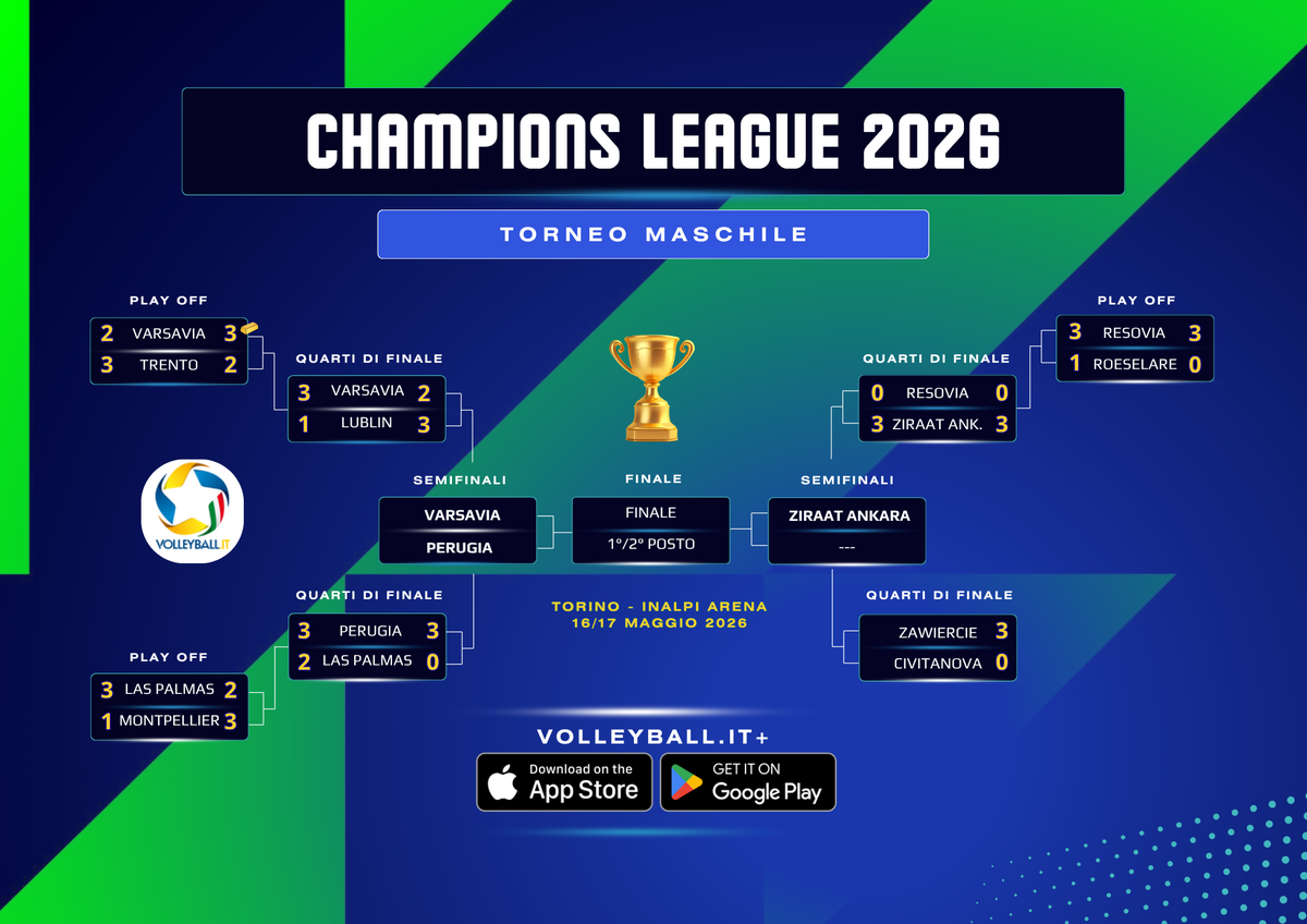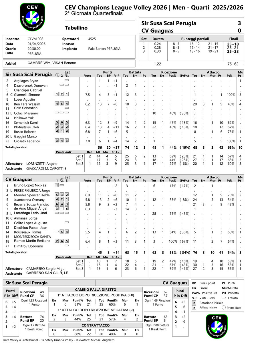 NOTE - durata set: 27', 27', 34'; tot: 88'. Sir Sicoma Monini Perugia: Battute Sbagliate 12, Vincenti 3. Guaguas Las Palmas (ESP): Battute Sbagliate 15, Vincenti 1.