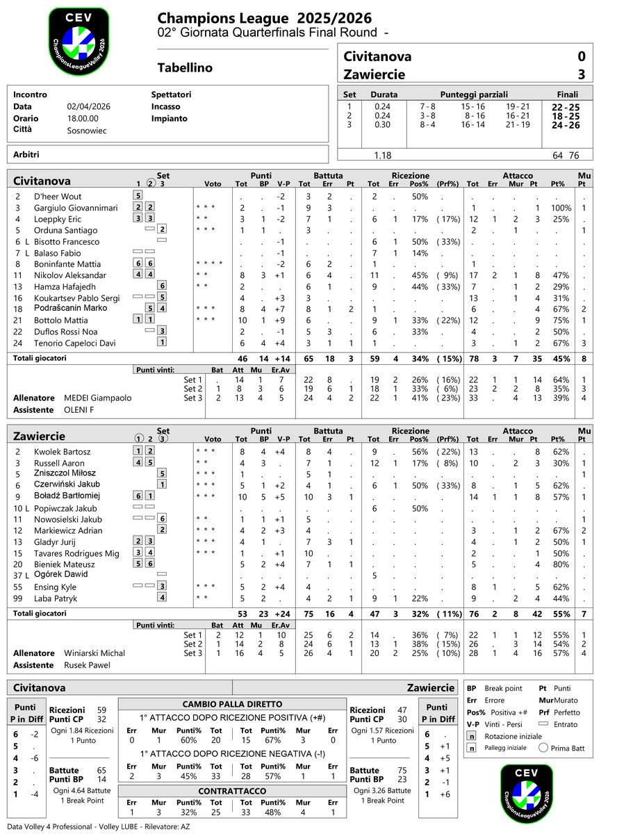 Note: durata set 24', 24', 30'. Totale 1h 18'. Civitanova: errori al servizio 18, ace 3, muri 8, attacco 45%, ricezione 34% (15%). Zawiercie: errori al servizio 16, ace 4, muri 7, attacco 55%, ricezione 32% (11%).